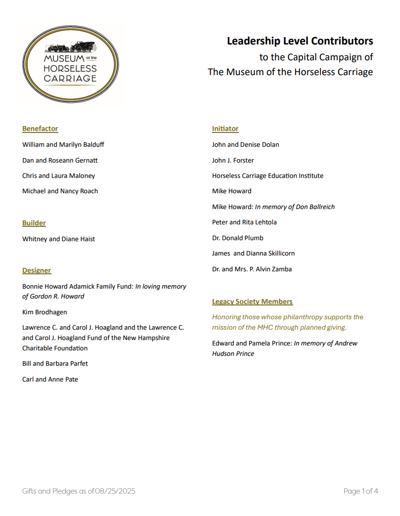 Major Gift Donors are the lifeblood of a museum. Your gift will enable the MHC to build a new museum to properly house and exhibit inspirational and important pre-1916 automobiles and fascinating artifacts from the Brass Era. Donors will receive recognition in the new museum building.